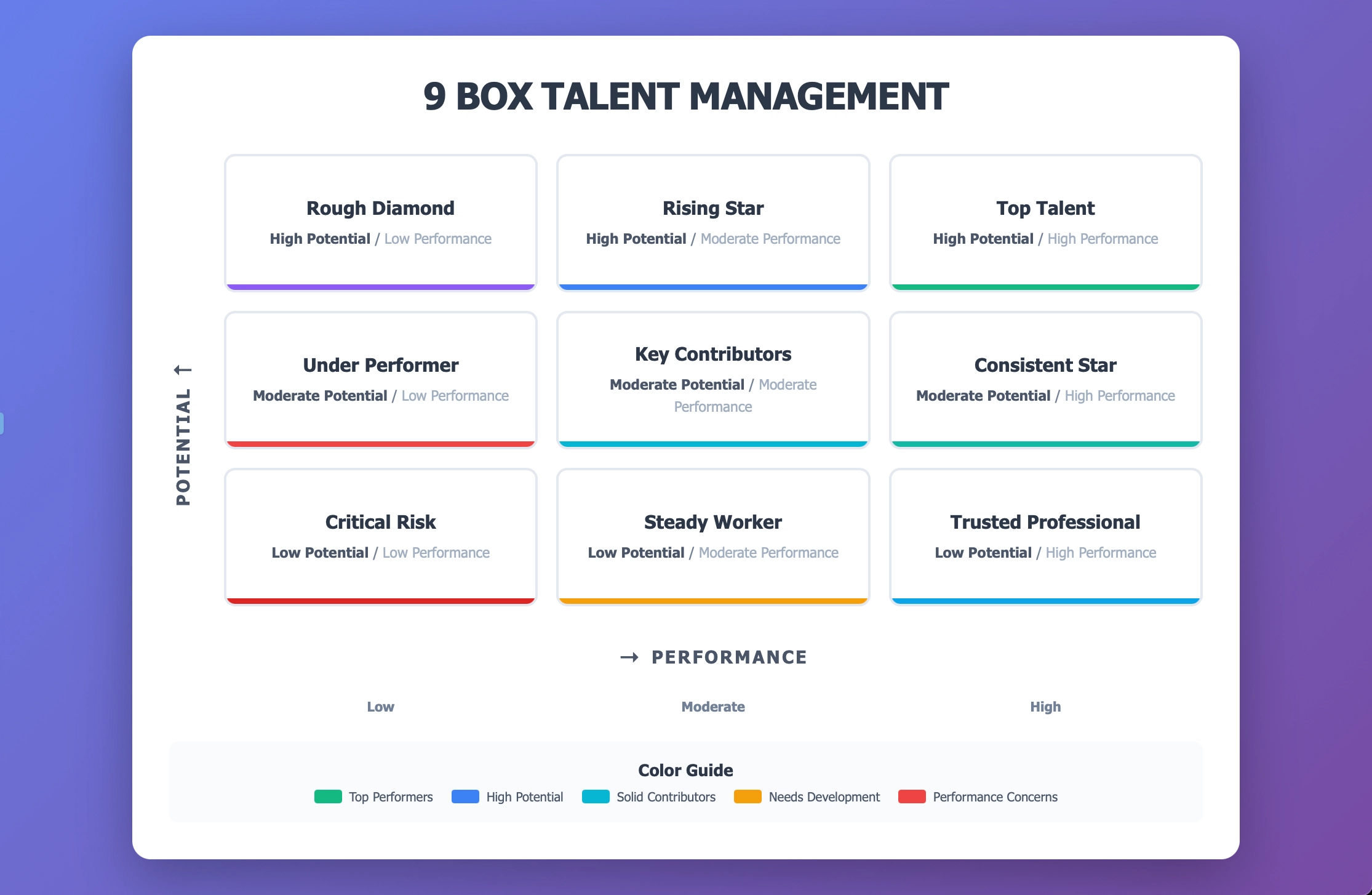 - Kuadran dengan kinerja tinggi dan potensi tinggi sering disebut sebagai kelompok bintang. Mereka dipandang sebagai kandidat kuat untuk peran kepemimpinan dan perlu mendapatkan proyek strategis serta pendampingan intensif.