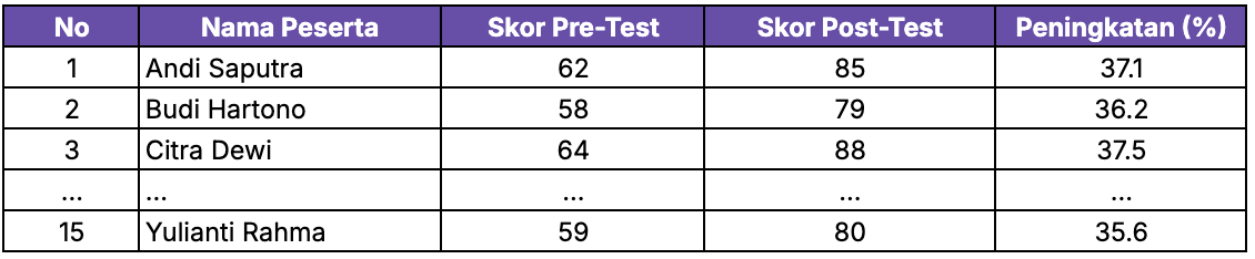 Sebagai ilustrasi, berikut contoh laporan pelatihan digital marketing untuk 15 peserta: