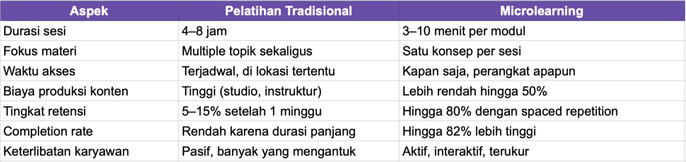 Microlearning adalah pendekatan pembelajaran yang membagi materi menjadi modul-modul kecil dan berfokus, biasanya berlangsung antara 3 hingga 10 menit per sesi, dengan satu tujuan pembelajaran yang spesifik untuk setiap modulnya. Berbeda dari pelatihan konvensional yang cenderung memadatkan banyak informasi dalam satu sesi panjang, microlearning dirancang untuk bekerja selaras dengan kapasitas alami otak dalam menyerap dan mempertahankan informasi baru.