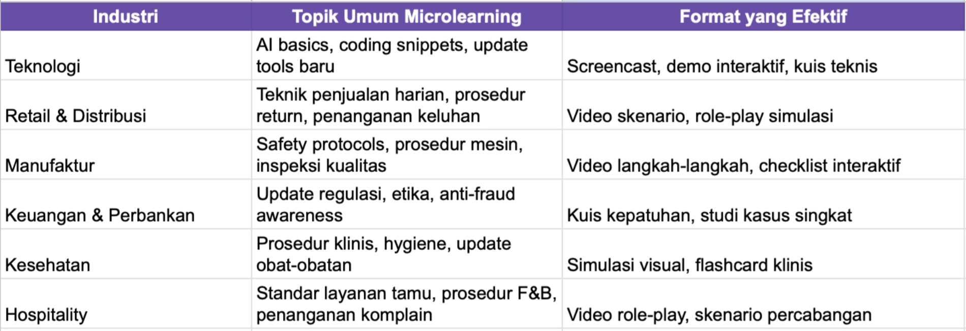Salah satu kekuatan microlearning adalah fleksibilitasnya untuk diadaptasi ke berbagai konteks industri. Format yang sama dapat diisi dengan konten yang sangat berbeda tergantung kebutuhan spesifik tiap sektor. Berikut pola penerapan yang paling umum ditemukan:
