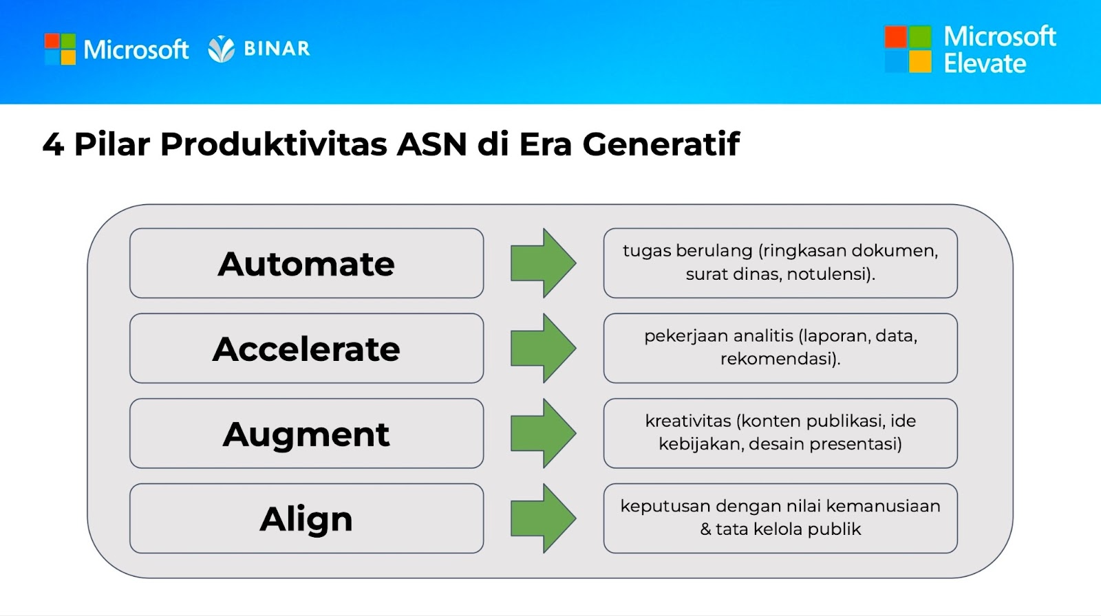 Salah satu sesi yang paling diminati adalah “4 Pilar Produktivitas ASN di Era AI”, yang memfokuskan pada penerapan AI untuk: