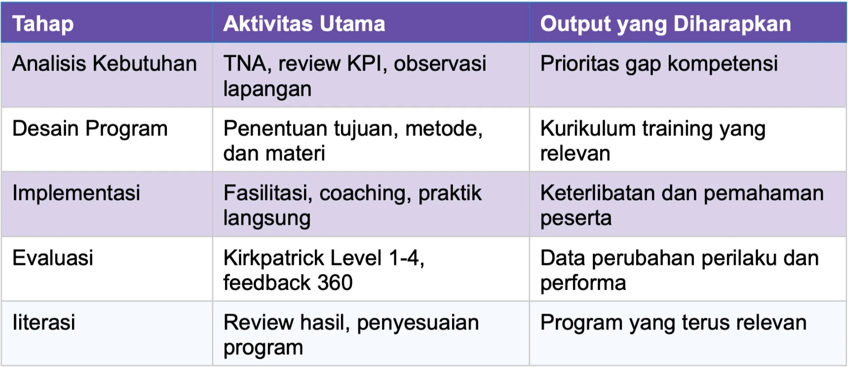 Berikut kerangka sederhana untuk memastikan program training berjalan secara efektif dari awal hingga evaluasi: